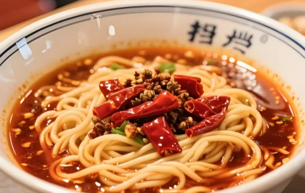 Characteristics: Dan Dan Noodles are a popular Sichuan street food consisting of thin wheat noodles served in a spicy, savory sauce made from chili oil, sesame paste, soy sauce, and minced pork. The dish is named after the carrying pole ("dan dan") that street vendors used to transport their ingredients. Topped with chopped scallions and peanuts, Dan Dan Noodles offer a burst of flavor in every bite.