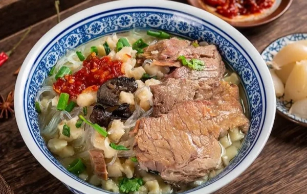Yangrou Paomo is a traditional lamb stew served with unleavened bread (mo). Diners tear the bread into small pieces, which are then simmered in a rich, fragrant broth with tender lamb, vermicelli noodles, and fresh herbs like coriander and garlic chives.