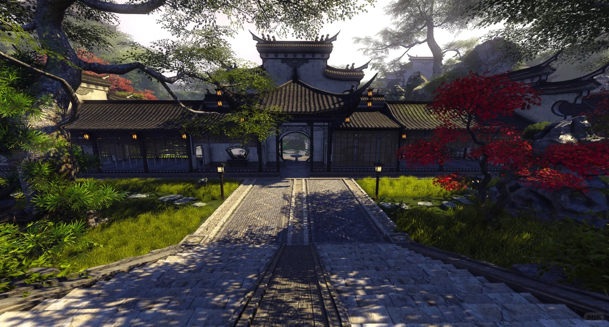The academy’s design harmonizes with its natural surroundings, featuring a series of courtyards, pavilions, and halls arranged along a central axis: