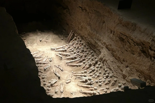 Burial Pits: Over 10,000 pits arranged in a grid, displaying terracotta figurines, animal sculptures, and daily utensils.