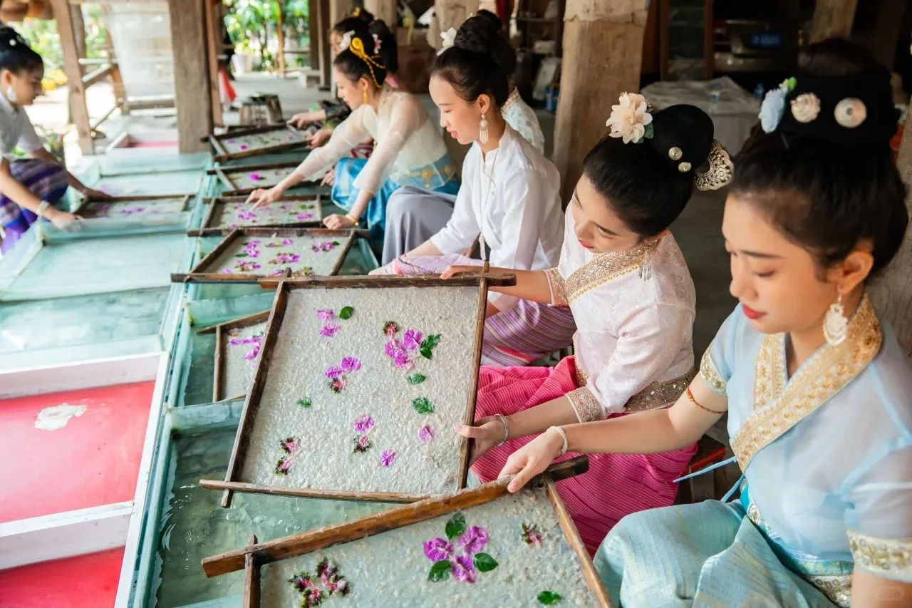Artisans in the garden demonstrate time-honored skills, such as slow-loom weaving of tubeik (indigo-dyed cotton) and silver filigree jewelry-making. Visitors can participate in workshops to craft their own tubeik scarves or bamboo souvenirs. The Paper-Making Museum showcases how the Dai create sa paper from mulberry bark, a craft passed down through generations.