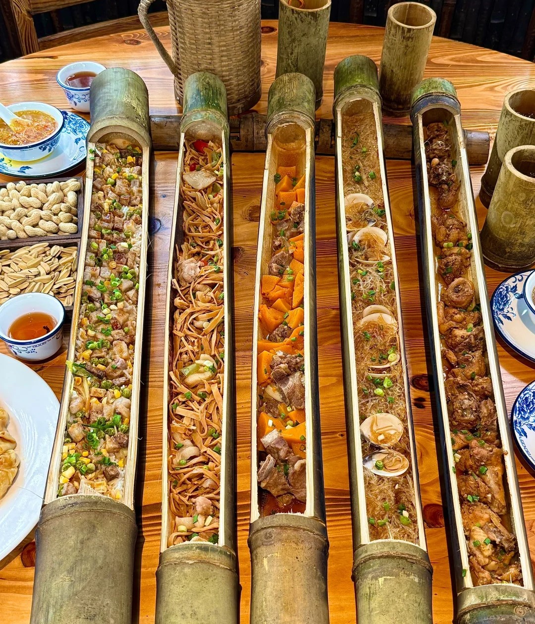 Grilled Delights: Xianglu (spicy pork skewers), Banana Leaf Fish, and Bamboo Rice.